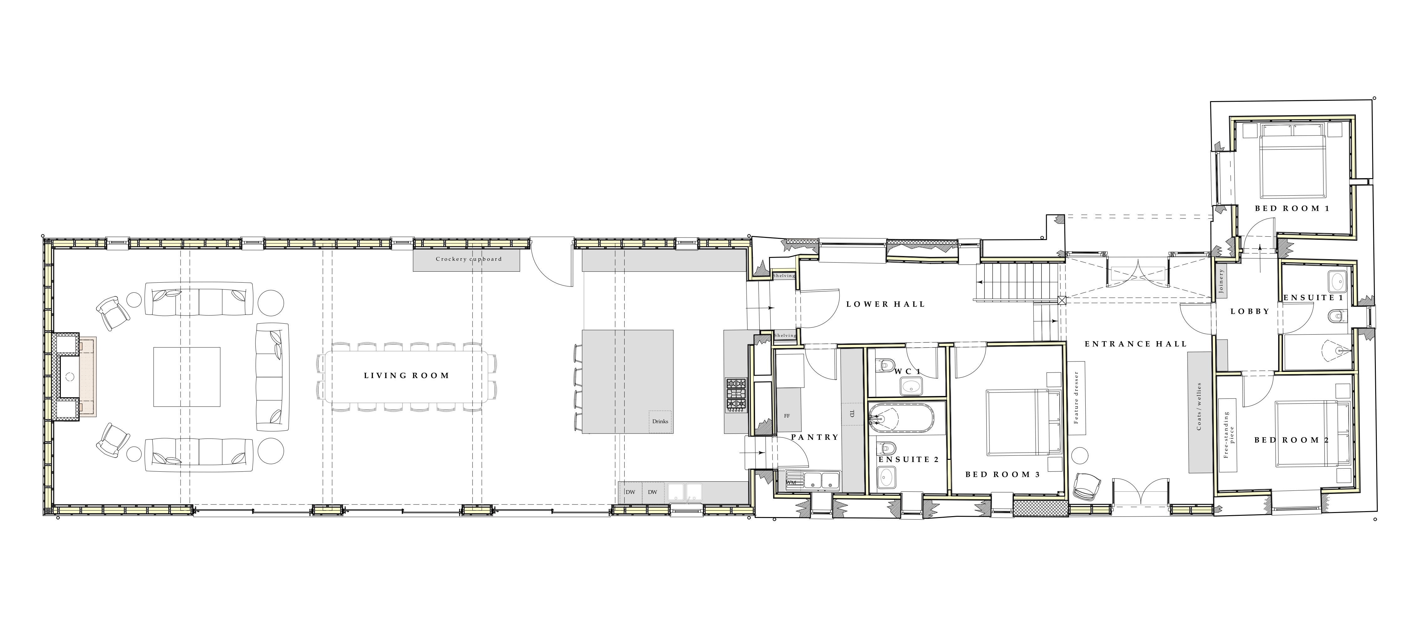 The enormous open plan living space has a kitchen with a walk-in pantry to one end, a long refectory style table in the middle, and at the other end, a living room area with sofas and chairs and an open fire.